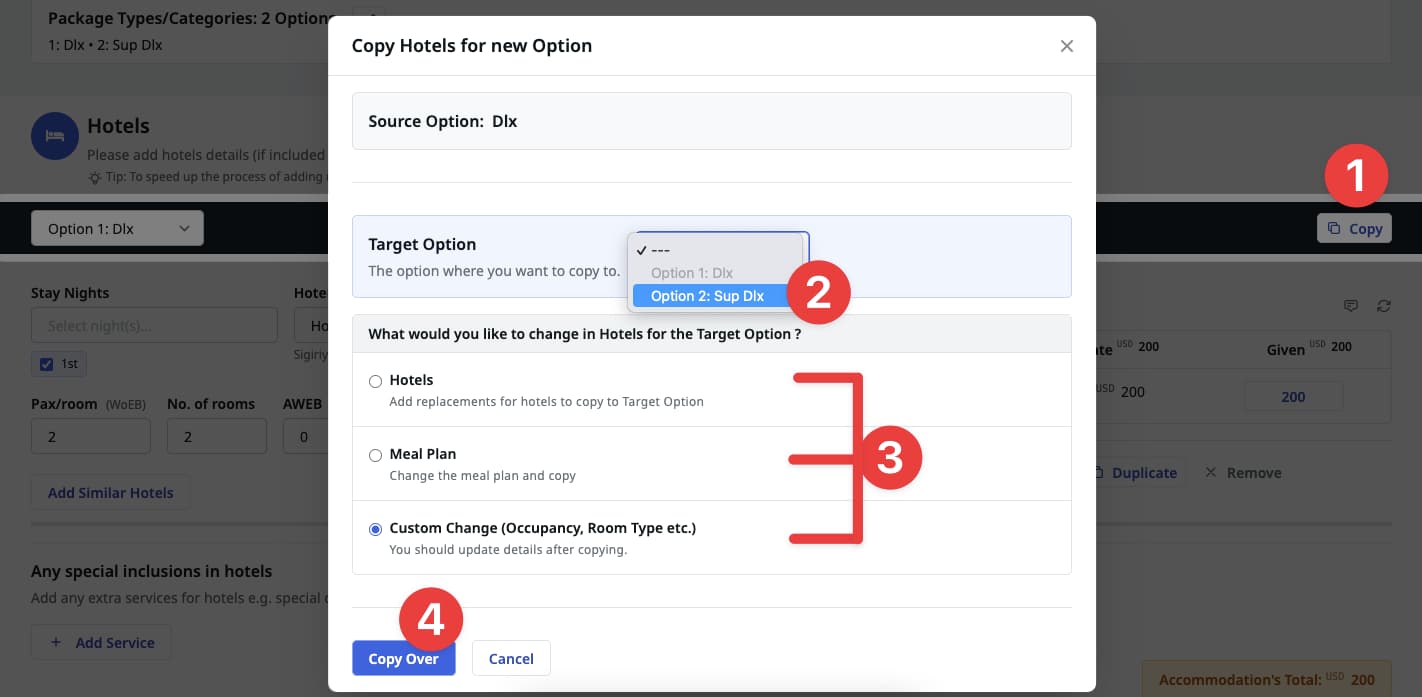 Once you have selected a change type and have provided necessary details, click on the “Copy Over” button to set hotels details for the next/target option. If you need to change anything, feel free to change the hotel details after copying.