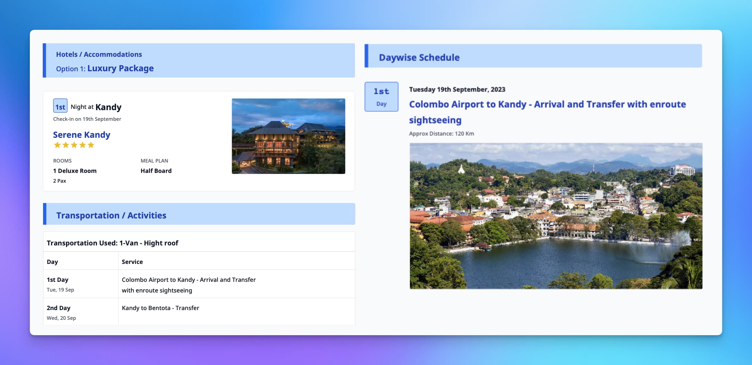 Next, you should review the Hotels and Other services given for each option along with total prices. System will automatically calculate the per-person prices for every option in one-click.