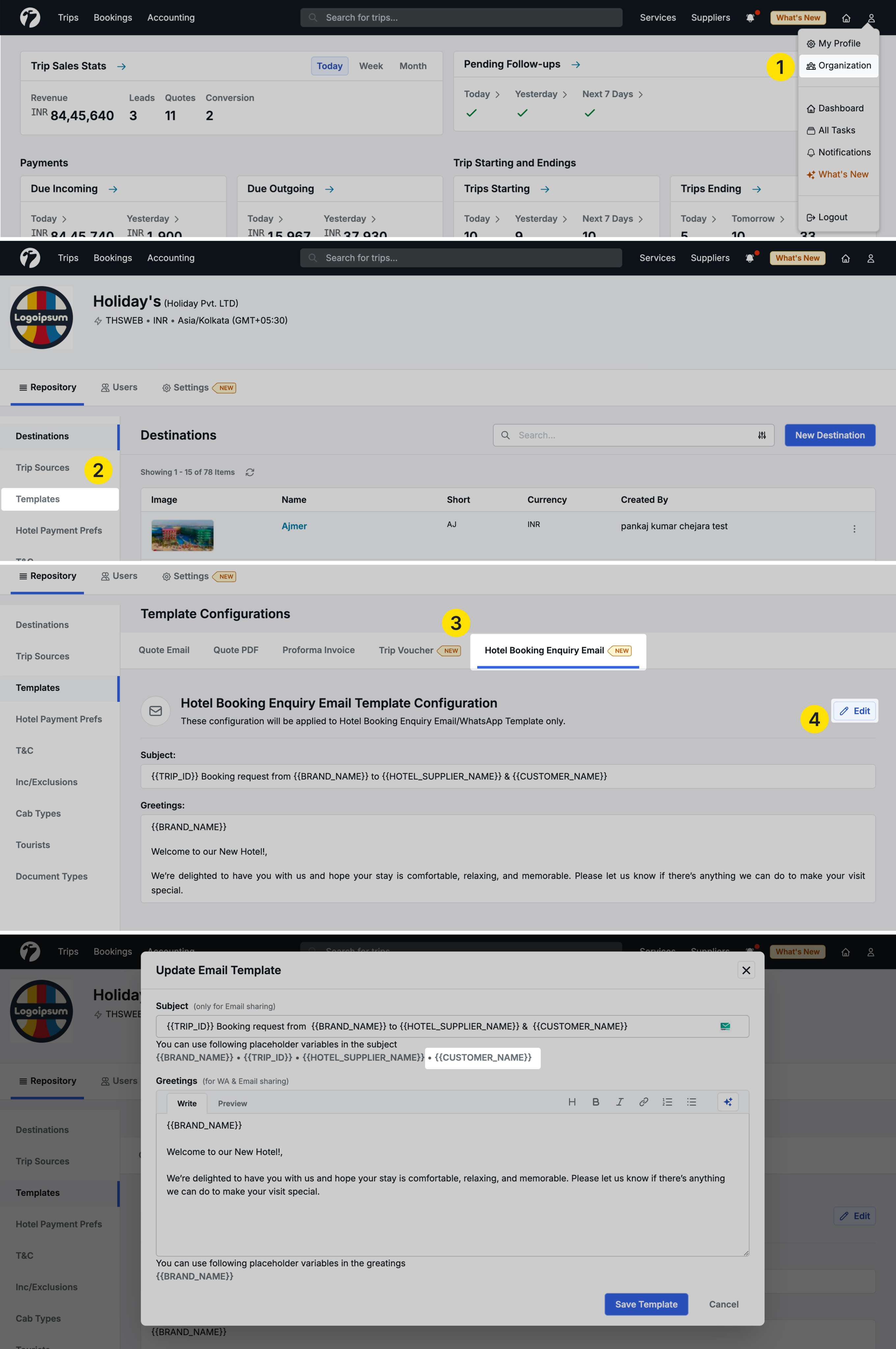 Navigate to Profile → Organization → Repository → Templates → Hotel Booking Enquiry Email Template