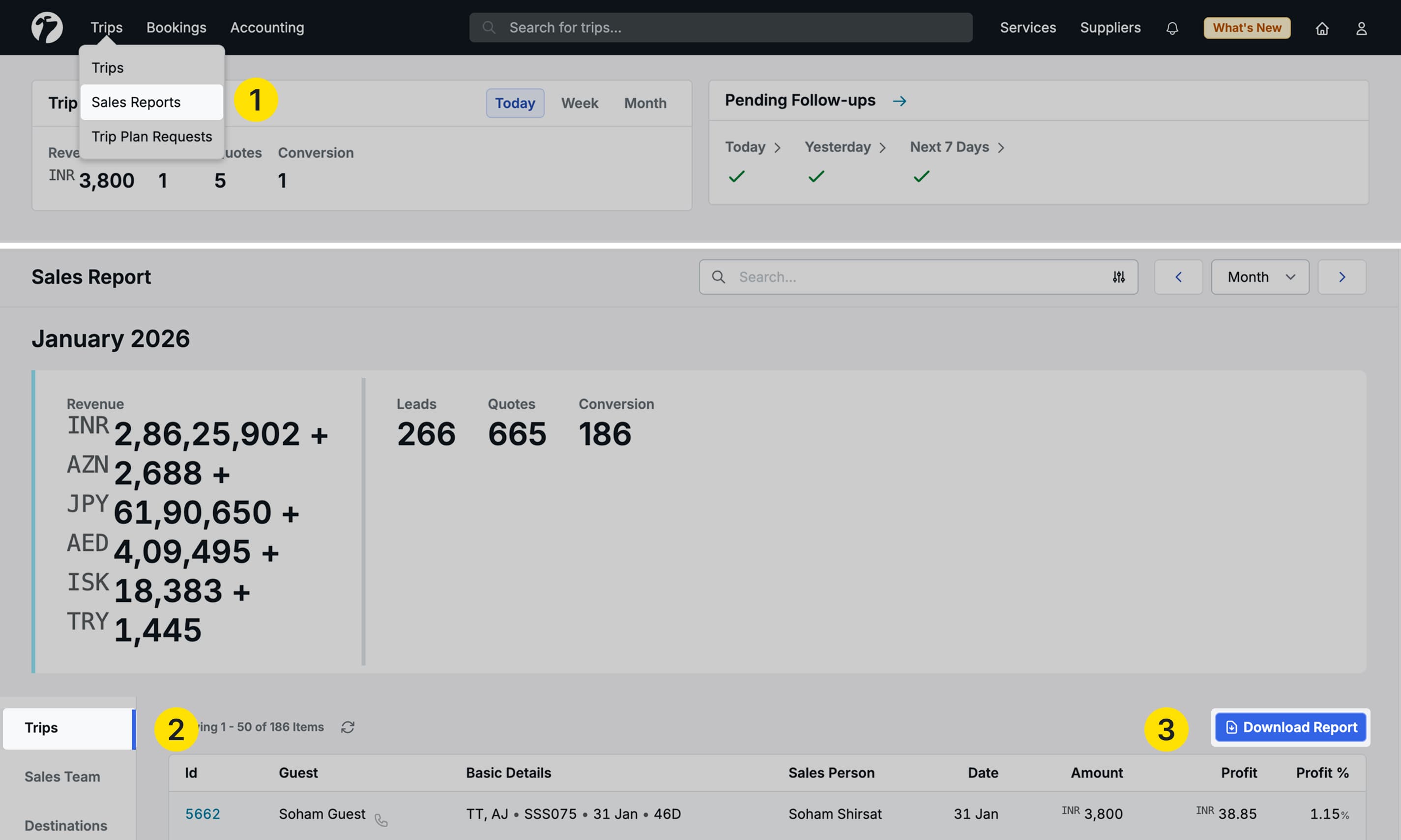 Navigate to Trips → Sales Reports and access: