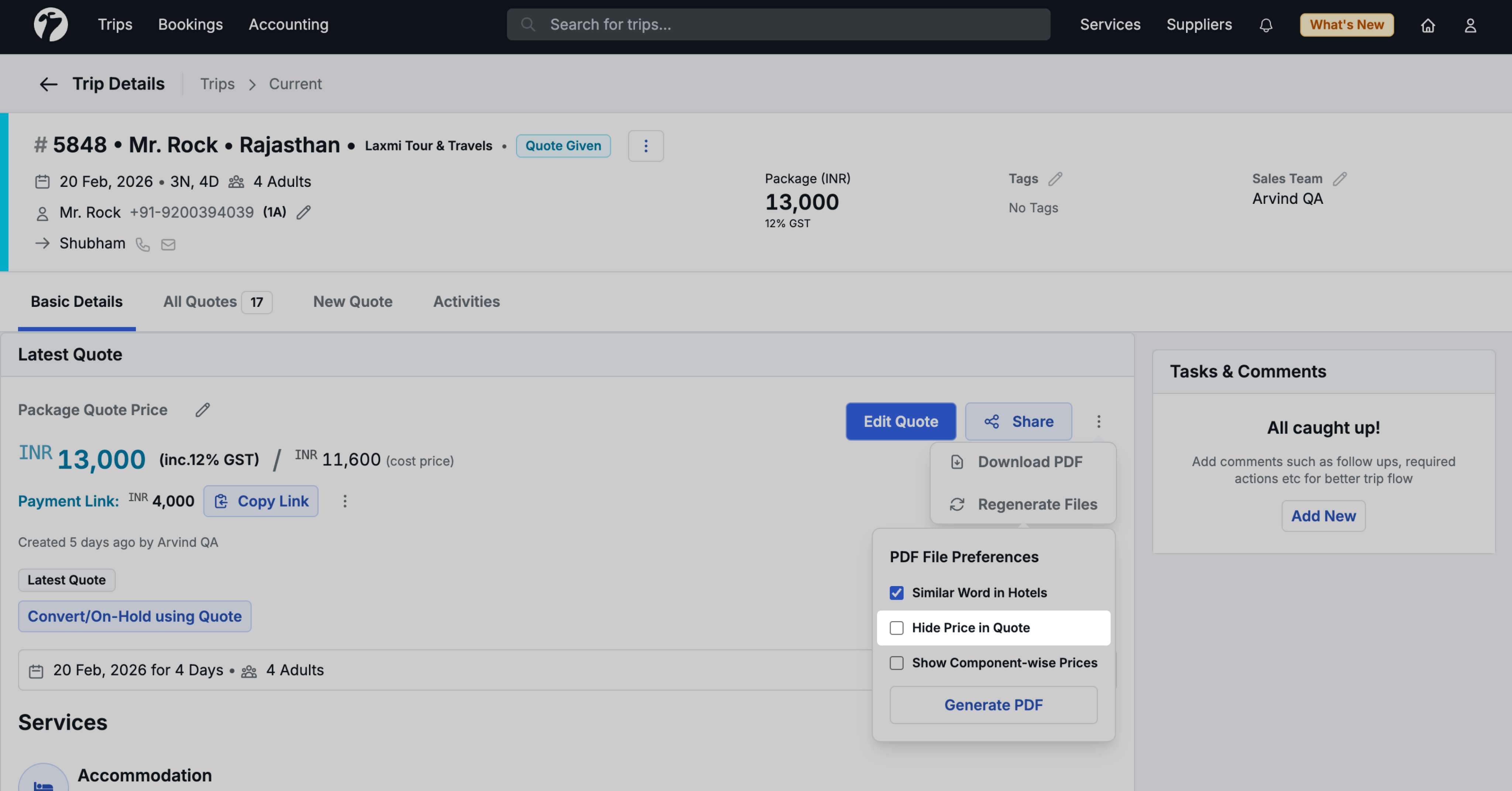 This update introduces a powerful bulk payment clearance system that allows you to log multiple payments in a single transaction, streamlining your payment workflows. We’ve enhanced the Quotation PDF with pricing visibility controls and component-wise totals, added comprehensive report activity tracking for admins, and improved supplier management in operational bookings. Guest salutations are now supported system-wide, and several workflow improvements have been added across payment verification, templates, and reports.