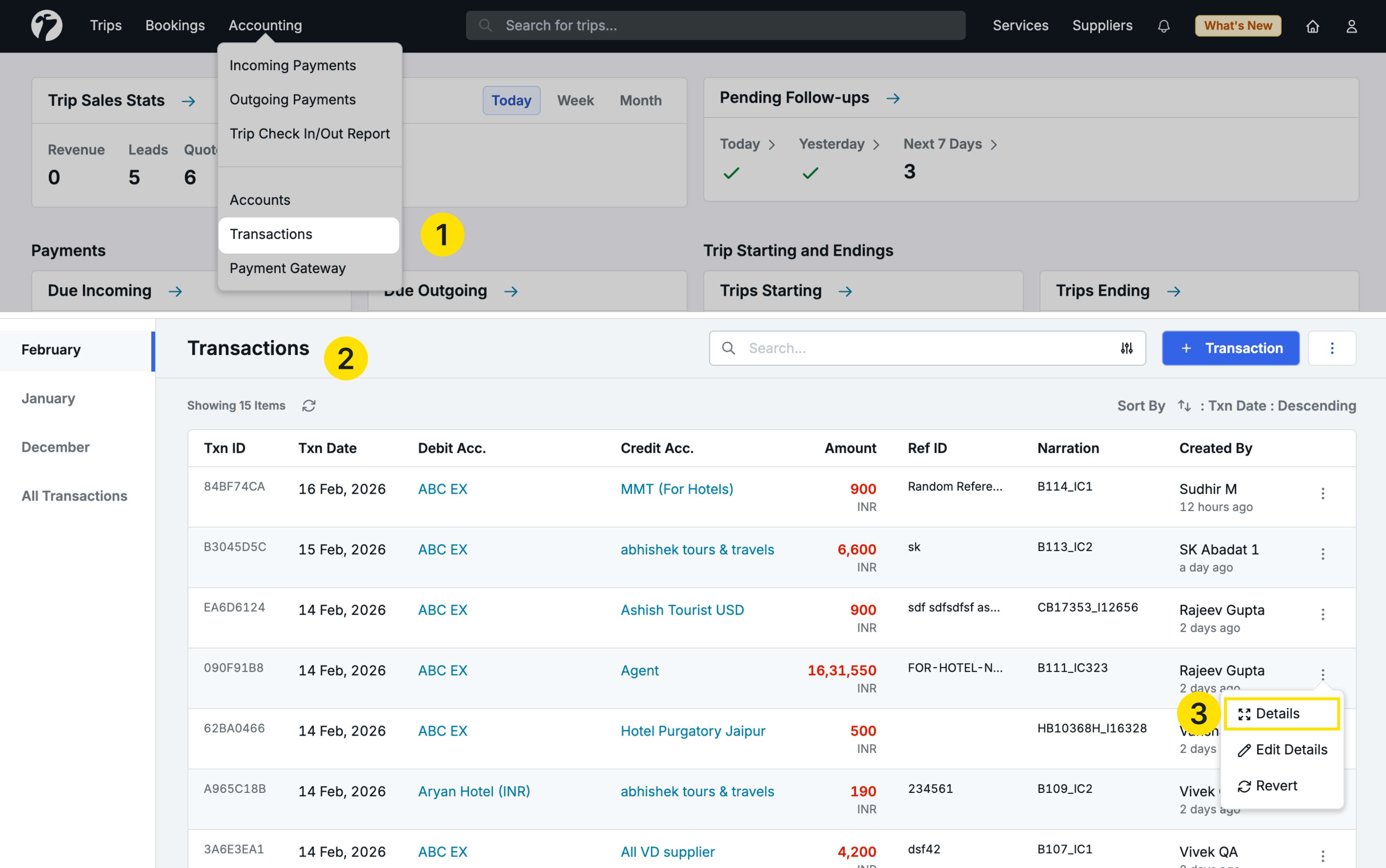 - Contact: Details about the payment including associated trip, service type (activity/hotel/transport), and other relevant information