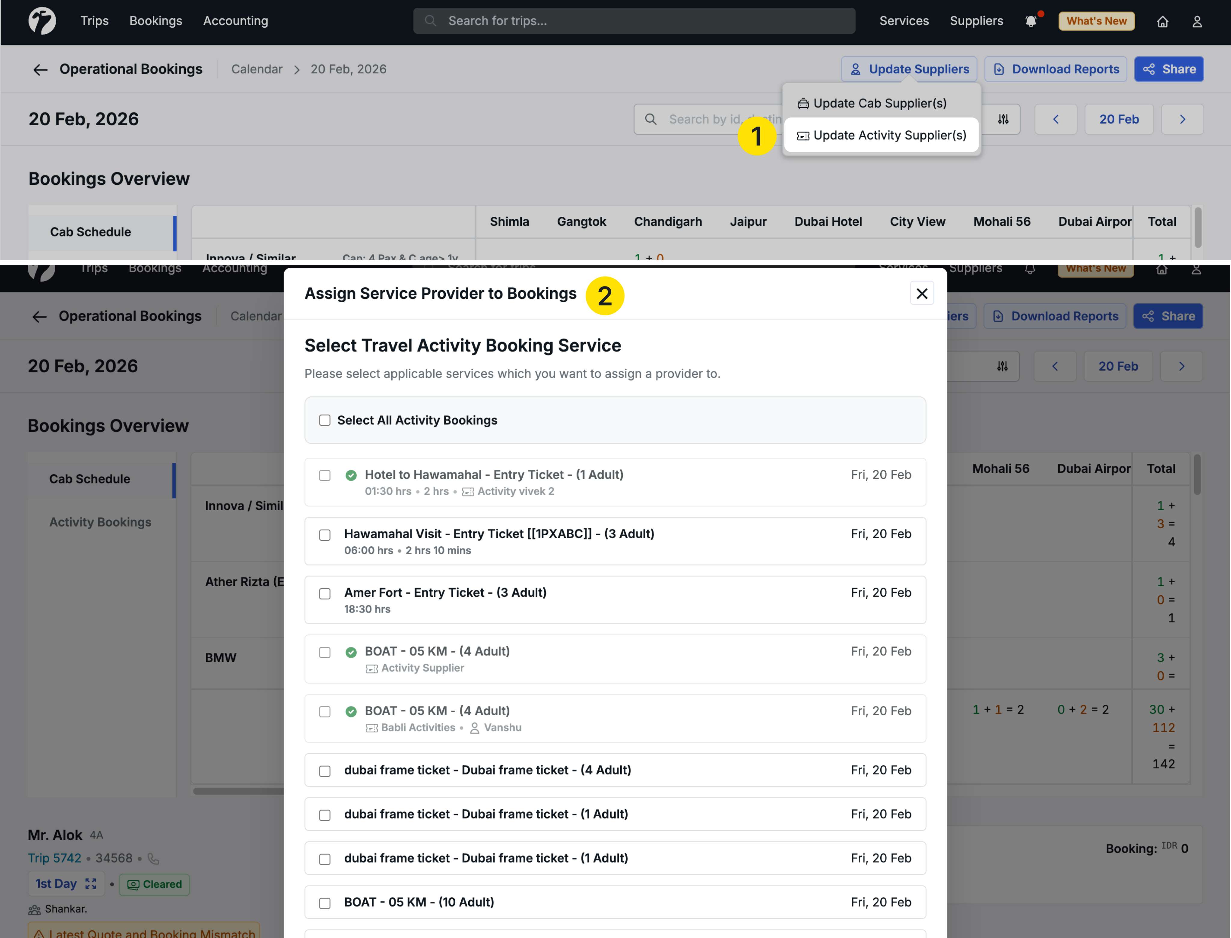 - Operational Bookings → Select a day → Click on any transport or activity service