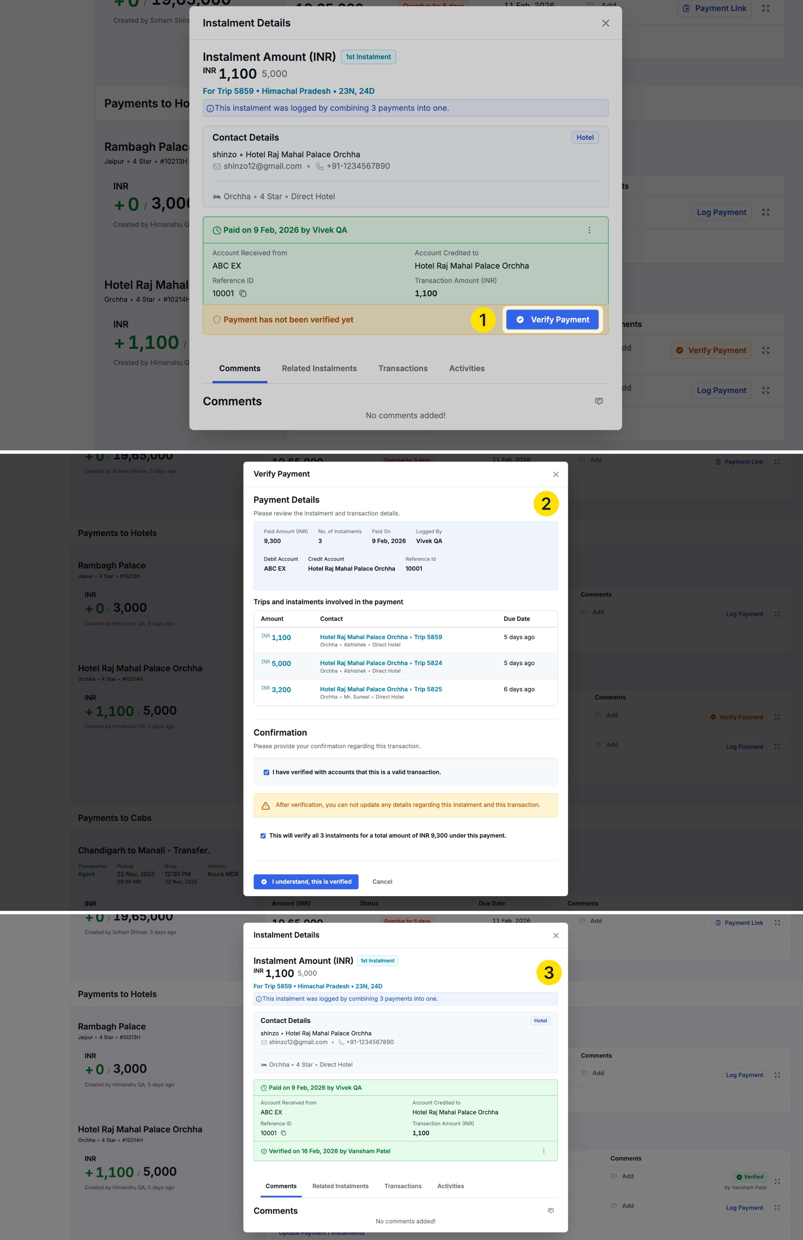 After logging bulk payments, you can verify, unverify, or revert them through the Installment Detail Page.